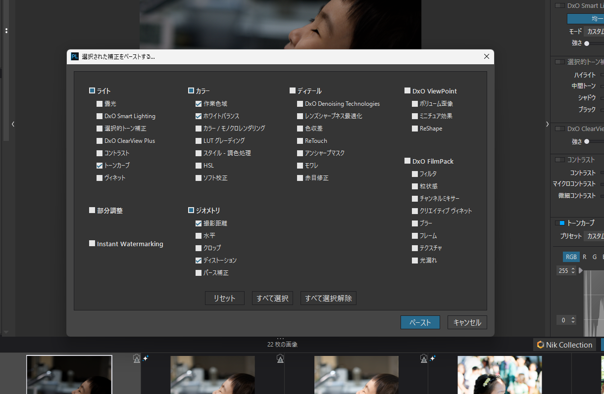 多くの写真を現像する場合に必須なのがプリセット(現像の設定や調整を保存・呼び出し)と同じような場面の写真調整のコピー機能でです。
